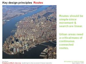 3. routes need to be simple and continuous not convoluted – not understood yet the urban record speaks for itself. Most notable when architects produce labyrinths in designing Middle Eastern layouts because they think Middle Eastern layouts are labyrinthine. Movement is essentially linear since it is so often purposeful, destination-oriented.