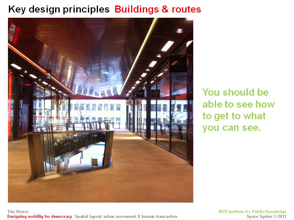 5. you should not only be able to see a destination but also the way to reach the destination – most notably when changing levels in urban space or in a building – I might be able to see the attractor, whatever it is, but can I see my route to it.