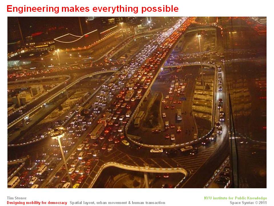 Heroically engineered mobility in the form of great road intersections such as that in Beijing is – with notable exceptions – the default response of the global transportation community and therefore of the political system. Witness the federal response to the current economic recession and the bent towards building and fixing highways.