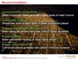 When these five conditions are achieved, the result is a system of everywhere to everywhere relations, creating structured contact between local inhabitants and visitors/passers by. These local-to-global relations, structured through patterns of centrality are the building blocks of the transactive city. They need to be understood and designed in.