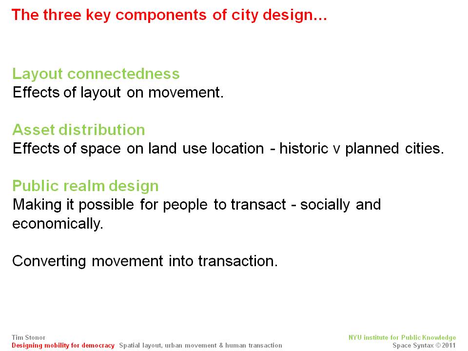 Which is why the city, be it online or onland, needs careful design of its three key patterns: its spatial layout patterns, its urban movement patterns and, ultimately, its patterns of human transaction.