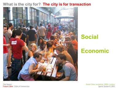 If the 20th century city was the “city of movement” then the 21st should be the “city of transaction”.