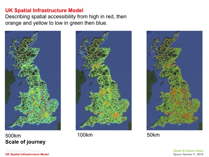 This is a model of the spatial infrastructure of Great Britain (and will soon include Northern Ireland to become a model of the United Kingdom). It allows us to zoom in and out on cities, towns and villages as well as the connections between them. It also lets us understand the hierarchy of connections at different scales – which routes are more important at a local, pedestrian scale and which are more important at a cross-country, car scale. More important routes are coloured red, then orange and green to less well connected routes in blue.