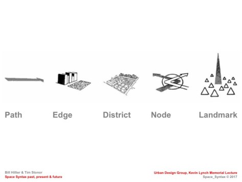 “In fact, from the point of view of the city as a whole, there is a remarkably interesting proposition in The Image of the City: ‘The paths, the network of habitual or potential lines of movement through the urban complex, are the most potent means by which the whole can be ordered’. (Kevin Lynch, IC p 96). Compared with this network, he adds, the ‘edges, districts, nodes and landmarks’ are the ‘design of other elements’. p 99. The form of the city, and the interrelating of the five elements, arises from how the network of paths is structured.”