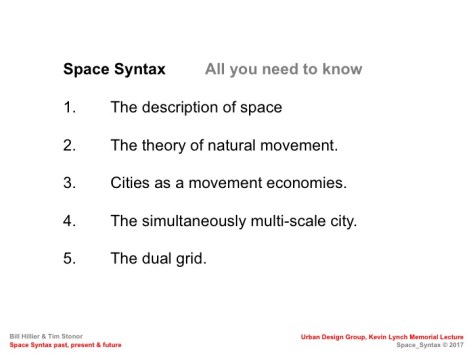 So let me, in one slide, try and explain the five key concepts that underpin Space Syntax.