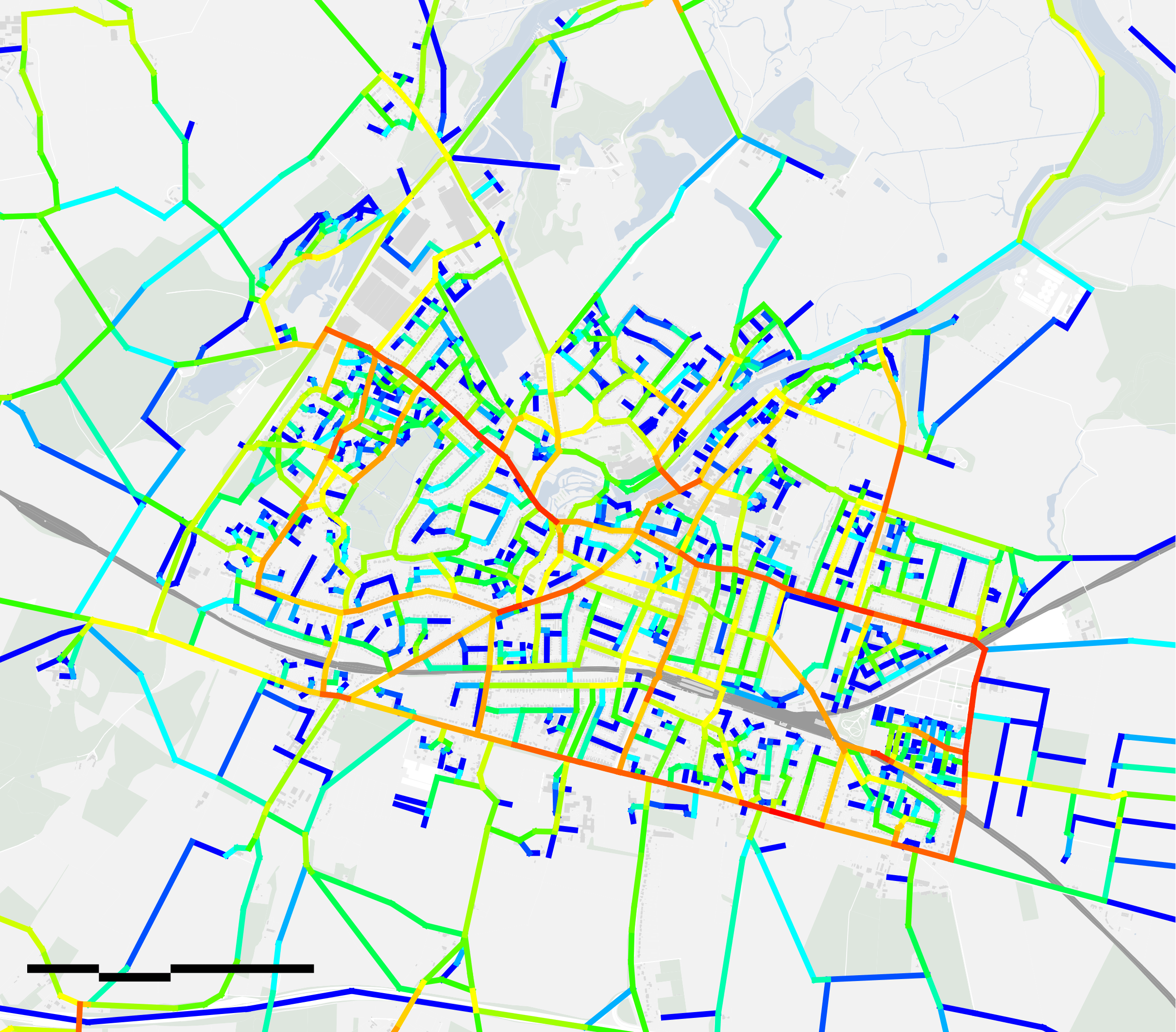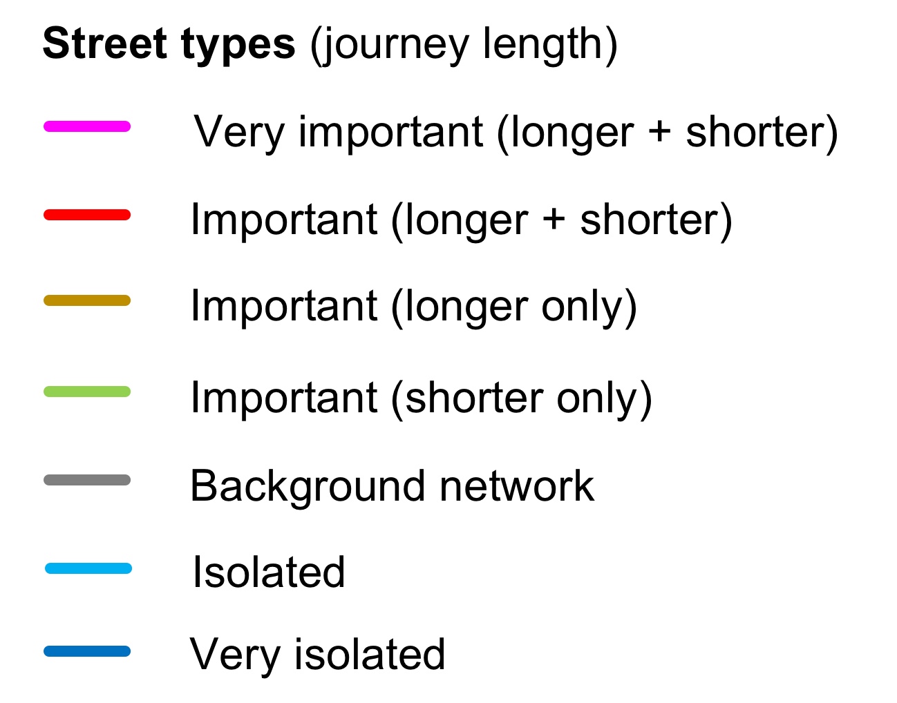 However, the overall importance of any street segment may vary depending on the scale of the journey. Some segments are more likely to be used as part of longer journeys, some as part of shorter journeys, some at both scales and some at neither.