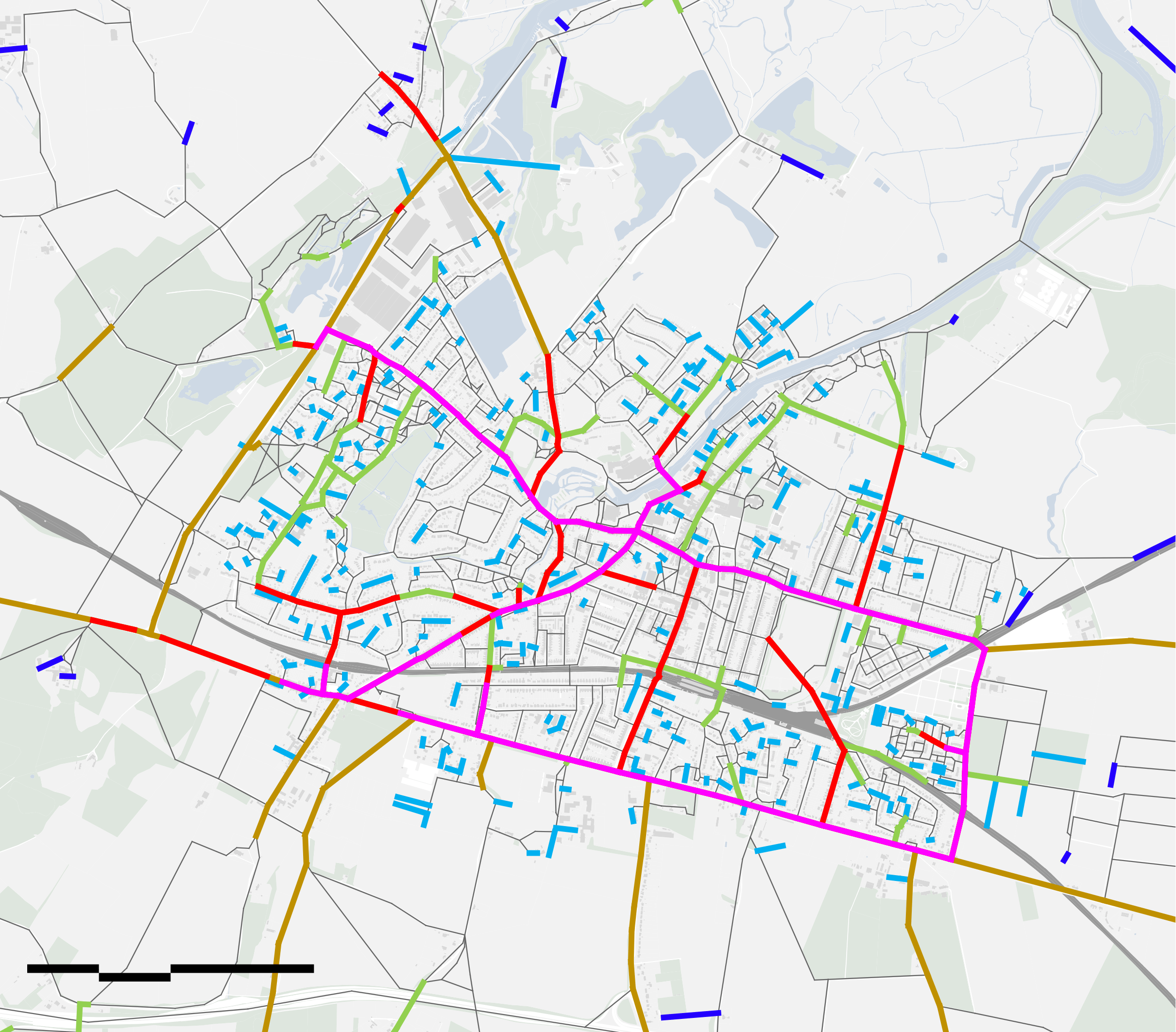 ‘Street Type Analysis’ combines the results of the Spatial Layout Attraction modelling at the longer and shorter journey catchments of 10km and 1.2km. It identifies different types of street, according to the importance of each street segment at one, the other, both or no scales of journey.