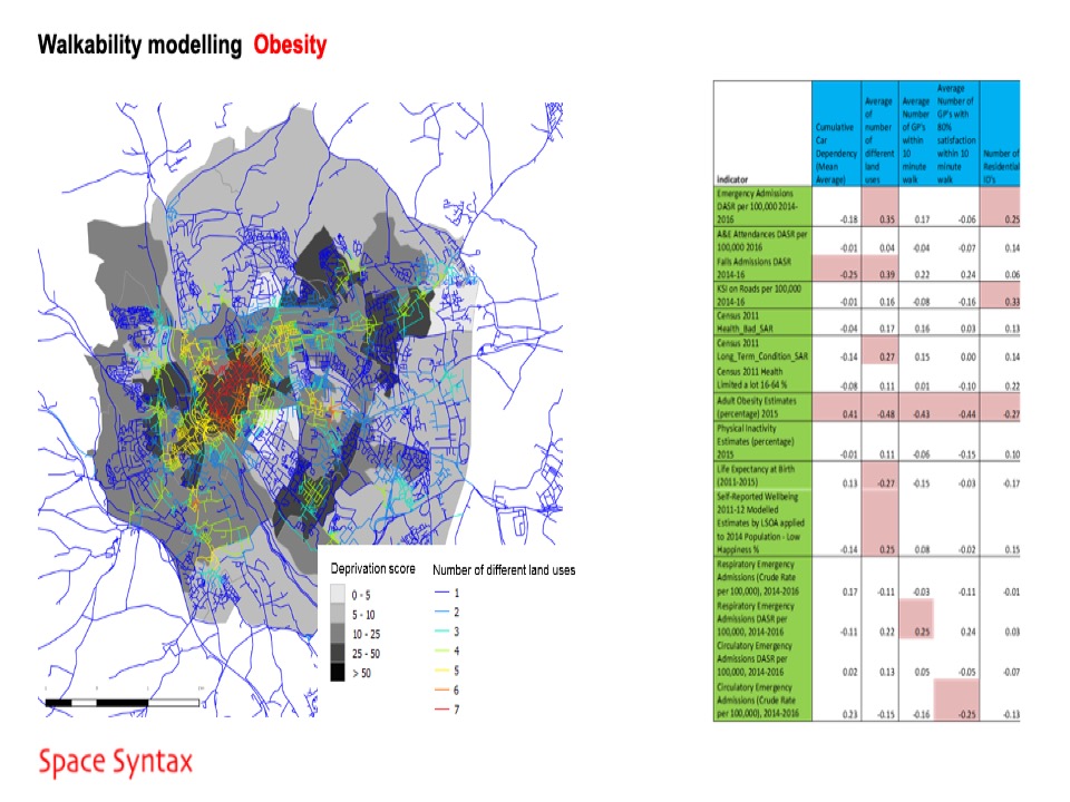 Computer modelling of street connectedness, combined with statistical analysis of public health, has also revealed important impacts on health. People are more likely to be obese in places that are less connected because these places encourage less walking, and less overall physical activity.
