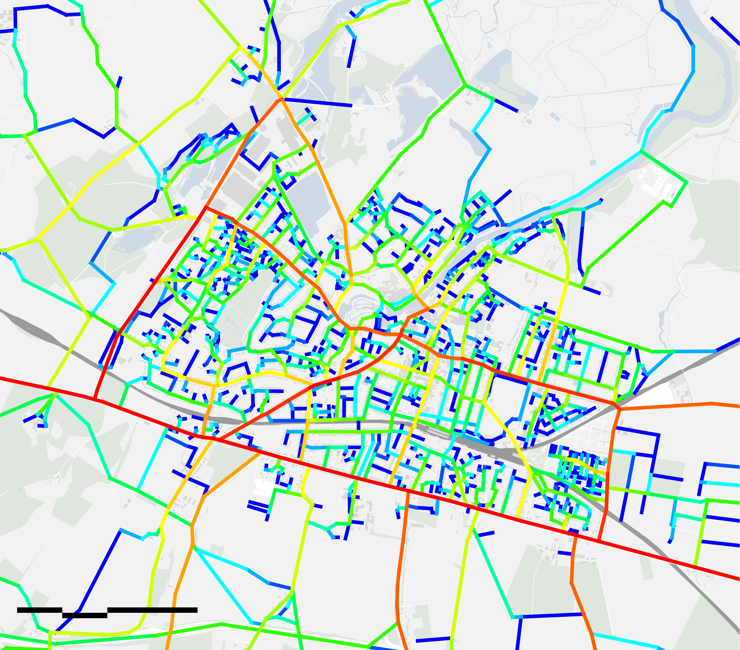 However, the overall importance of any street segment may vary depending on the scale of the journey. Some segments are more likely to be used as part of longer journeys, some as part of shorter journeys, some at both scales and some at neither.